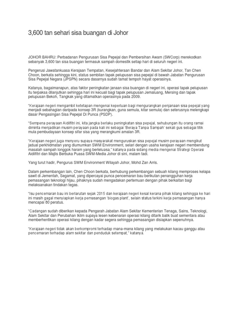 3 600 Tan Sehari Sisa Buangan Di Johor